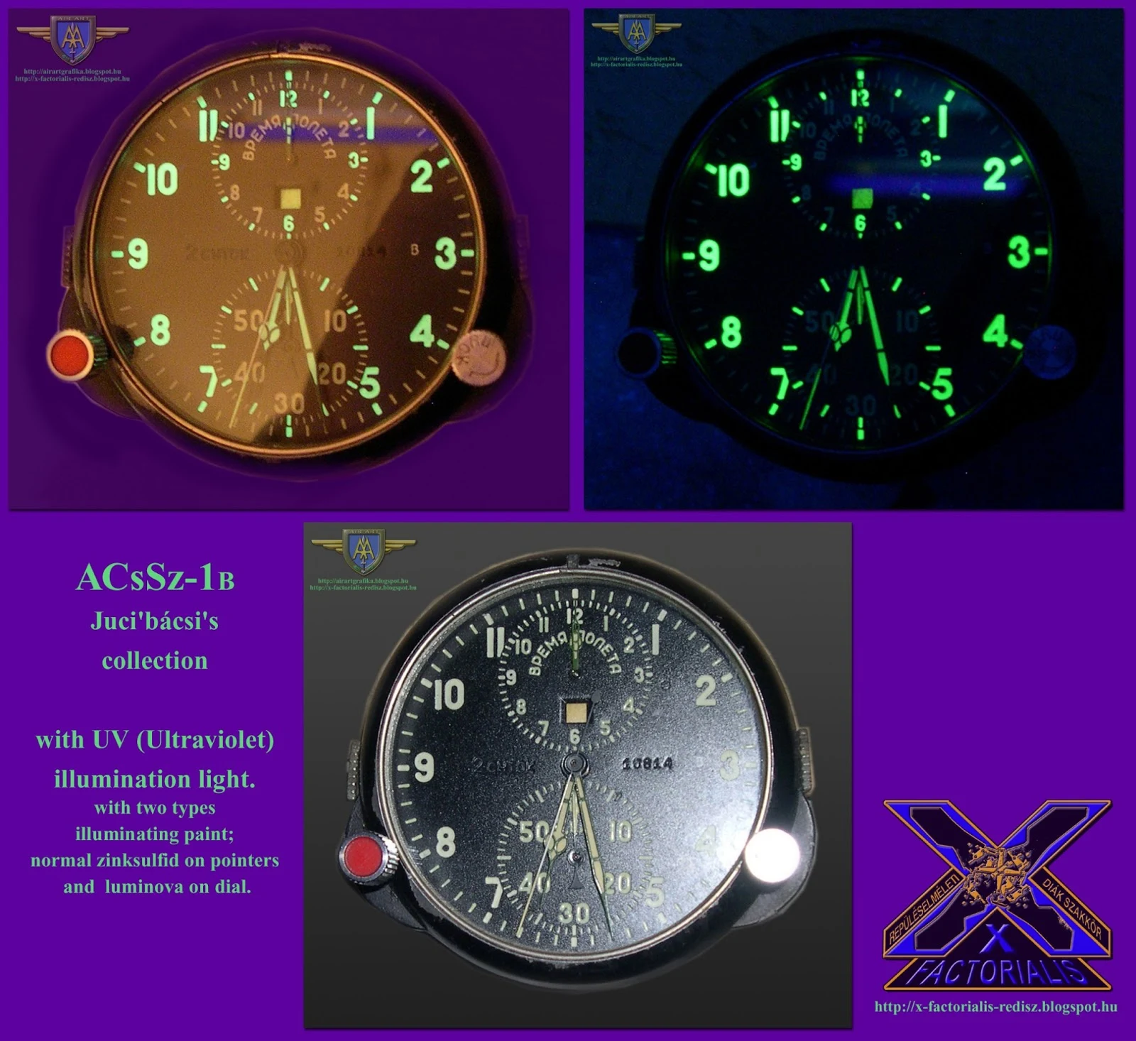 Hu. text: ACsSz-1MK (АЧС-1) típusú – АВИАЦИОННЫЕ ЧАСЫ – Самолет/ХРОНОМЕТР- repülőgép fedélzeti kronográf 1981 utolsó negyedévében gyártott érdekesség: egy hallatlanul kifinomult igényesen kidolgozott katonai, repülőgép fedélzeti óra, 8 napos járás idővel, de a megfelelő és pontos működés érdekében azonban célszerű kétnaponta felhúzni. A Szovjet/Orosz? svájci liszensz -LeCoultre ChronoFlite JAEGER Type A-10- (ezt akkoriban nem tudták volna gyártásra lemásolni!) gyártmányú ACsSz-1MK időmérő óra rendeltetése a pontos idő órában, percben és másodpercben történő megjelenítése, repülési idő mérése, valamint rövid, legfeljebb egy órás periódusok mérése percben és másodpercben. Az óra számlapján két segédszámlap található, 12 óránál a repülési időt mérő segédszámlap, 6 óránál pedig a 60 perc gyűjtő stoppermechanizmus segédszámlapja. Kronométer pontosság, két, független kronográfkör, az első perc-12 óra állapotkijelző ablakkal, a második másodperc-60 perc gyűjtővel, másodpercstoppal. Külön lemeztok konzolos beépítéshez. Kb. 8*7 cm, 80 mm-es kijelző átmérővel. ... Két rugóház - főrugó, 25 köves (mesterséges Rubin-kristály) svájci import, Breguet spirálrugó, nagy, kompenzált kiegyenlítéssel/billegővel svájci horgony-járat. Kronométer pontosság, két független kronográf mechanika, az első perc-12 órás bekapcsolást jelző állapotjelző kisablakkal, a második 60 perces kollektorral, stop-másodpercek.