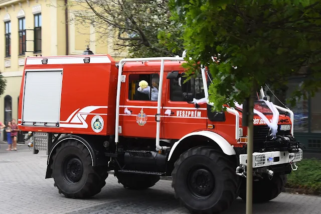 above: NEW! HiRes! Wedding - Esküvő in Hu. Veszprém downtown by Mercedes-Unimog TLF 2017.09.30. (My Former Pilot mate Adorjan's daughter medical 1st Lt. Zsófia fhdgy. MH.KK. source: facebook: Adorján László