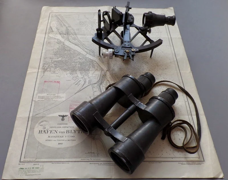 above: new pic! NoHigh! Kriegsmarine Chart of Port with Sextant and Binoculars - Fernrohr