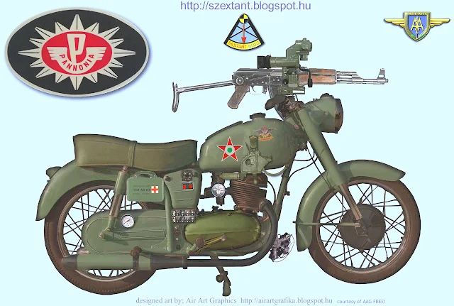 above: Juci'bacsi's fantasy artwork 2012: HiRes! NEW! Color correctioned! made in Hungary Pannonia TLT-250 "Turbo" equipped with Kalashnikov AKs-47 assault rifle and ect. small parts of aviation equipments. - Csepel gyártmányú Pannónia katonai-motorkerékpár AK-47 gépkarabéllyal felszerelve és turbóval kiegészítve.
