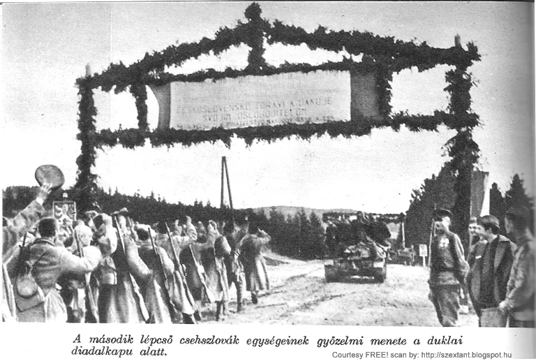 NEW! NoHigher! WW-Two: Czech Army gen. Ludvik Svoboda Hds.tbk.: book: 'from The Ural to Praha' - 'Az Uraltól Prágáig'; above: The Czechoslovakien units of second echelon's Winner march under Dukla triumphal arch below: Parad march of Czechoslovakien units from Sovietunion in Prága's oldcity square 1945. may 17. IS-2s from back source: Juci'bacsi's collection also Courtesy FREE!