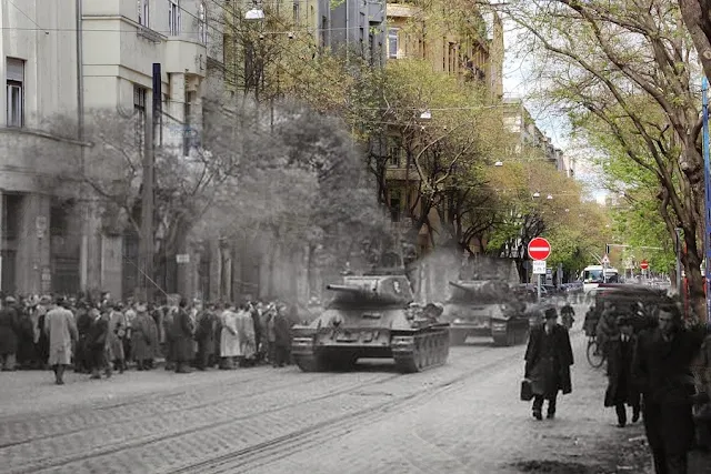above: MedRes! Hungarian T-34s moving on Pest side Duna-part-shore site? Backround is Soviet T-54