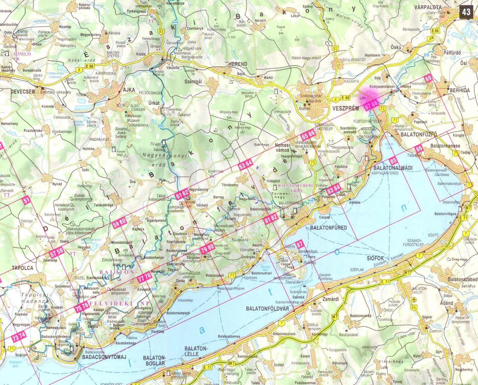 above: NEW! HiRes! Southern Bakony-mountains, North-Easern part of lake-Balaton 'SAMPLE' tourist map with grid source: térkép-atlasz webáruház