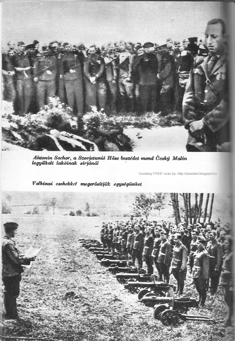 above: Upper! Antonin Sochor brave of SU speaks at grave of killed citizens Cesky Malin. Lower: We strong my unit with Volhinier Czechs ( Water cooled "Maxim" M.G. 7,62 mm)