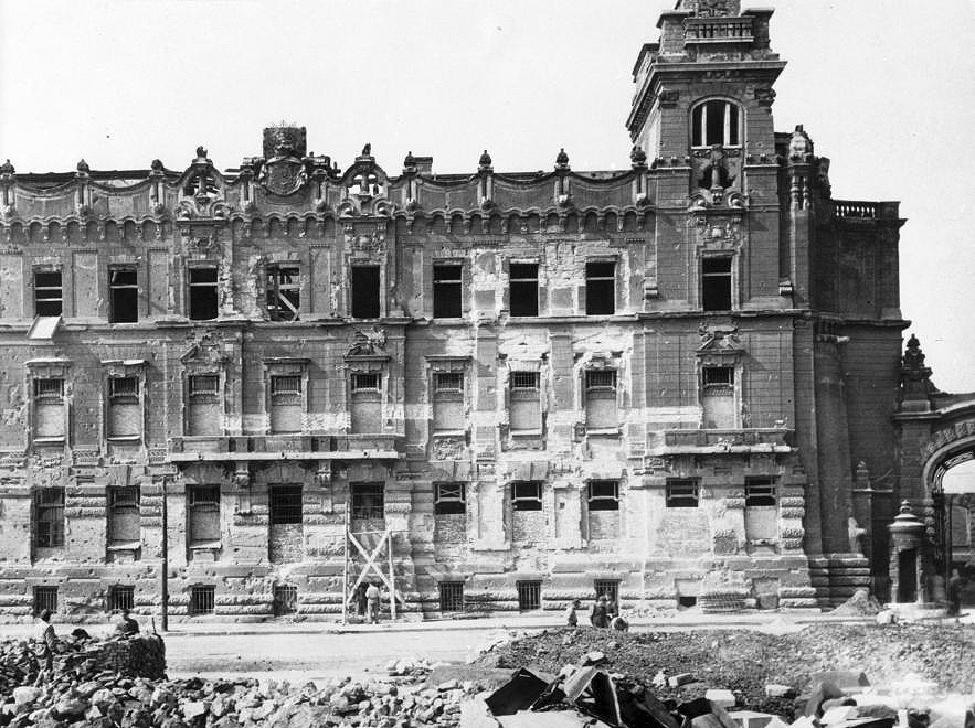 above: NEW! NoHigher! Demolition action: After Siege of Budapest 1945. View from Pest bank to Buda side, Battyhány-square and Buda-castle, with Mathias church - Aknamentesítés: Budapest ostroma után, látkép a Pestről a Batthyány tér és a budai Vár a Mátyás-templommal. source: Fortepan.hu