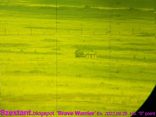 Hu. text: A Blogger személyes megjegyzése: Mint meghívott vendégnek a "Brave Warrior 2022" gyakorlaton megdobbant a tüzér és helikopteres szivem. Nem hiába szerelkeztem fel a PAB-2M Tüzér Tájoló Műszeremmel és digitális fényképezőgéppel. A MH. Pk.Dr. (Ph.D.) Ruszin Szendi Romulusz altbgy-tól rövid és közvetlen hangvételű általános tájékoztatót hallgattunk meg a jelenlegi katonapolitikai és a Magyar Honvédség állapotáról a fogadó sátorban. Amit és akkor onnan a tribünről láttam; A tribün lőtértoronyból Lőrincz Gábor dd.tbk. az MH 25. "Klapka György" Lövészdandár parancsnoka mint narrátor folyamatosan közvetítette a látható mozzanatokat. Az időjárás tökéletes NEIV - Nappal Egyszerű Időjárási Viszonyok volt a gépesített zászlóalj szintű bemutató gyakorlat végrehajtásához. - Nekem meglehetősen vérszegénynek tűnt mert a tűzerősebb és dinamikusabb végrehajtáshoz vagyok szokva. Az elején feltűnt, hogy a jobb szárnyon az MH. 25. L.dd. 101. tü.o. 152 mm D-20 'Khitin' vontatott ágyútarack tűzszakasz (3db. löveg) foglalt álcahálós TÁS-t - tüzelőállást ahonnan nagytávolságú közvetlen irányzású lőfeladatot (onnan lehet megállapítani, hogy alacsony cső emelkedési szögállásban voltak és a balra hátra kitett háromlábú K-1 kollimátor FKC - Fő Kisegítő Cél nélkül. Ennek okán megosztott irányzású lőfeledatra nem voltak felkészülve) hajtottak végre repeszgránáttal a Mórocz-tetőn lévő célpontokra. Továbbra is az elégedetlenségemnek adok hangot, hogy amióta a lőtérre kijárok nem láttam harcszerű TÁS elfoglalást és elhagyást (pedig az a közvetlen irányzásű feladatoknál gyorsabb és egyszerűbb: nem kell bemérő előkészítés és műszeres lövegtájolás). Bemutatkoztak a PzH2000 páncélos tarackok két db. (ami eddig megérkezett) is a jobb szárnyon előre elfoglalt nyílt TÁS-ból hajtottak végr közvetlen irányzású lőfeladatot. A MLE - Magyar Légierő részéről először egy BAe-SAAB JAS-39EBS-Hu többcélú vadászrpülőgép húzott át kb. H.terep 1000 méteres magasságon mint felderítő. Ezt követően megkezdődtek a gl. - gépesített lövész szárazföldi harcdinamikák. A lövészkatonák hevenyészett lövészfedezékban hasaltak aránylag közel egymáshoz. A BTR-80A PSzH-ák a toronyfegyverzettel támogatták a betolakodó/támadó ellenséggel szembeni küzdelmet. Ezt követően a bal szárnyról a tatai dandár Leopard-2A4Hu harckocsi szakasza és Szlovák hadsereg BMP-1 GyHJ - Gyalogsági Harcjárművei hajtottak végre ellenlökést amelybe később bekapcsolódott az Olasz hadsereg B1 'Centauro' kerekes PCFH - Páncélos Felderítő Harcjárműve is a 105 mm-es harckocsi ágyújával. Ezzel egyidőben az MLE szürke festésű Mil Mi-24P 'Hind-E' géppárja hajtott végre tűzcsapást a "Csum" melletti célpontokra melyet követően visszafelé a tribün két oldalán húztak vissza. - Az egyéb harceszközök szereplését nem láttam melyek a riportok alapján a validációs gyakorlaton vettek részt. Légvédelem, Légimozgékony művelet H145 többcélú helikiopterrel nem volt. Az ukrajnai háború tükrében nem győzött meg a gyakorlat a védelmünk korszerűségét illetően. Szeretnék már inkább egy éjszakai gyakorlaton részt venni mint néző. - Veszprém északi részén lakóként szoktam hallani a löveg dörgéseket, de még nem halottam nappal és éjszaka korlátozott látás N-ÉBIV - Nappal - Éjjel Bonyolult Időjárási Viszonyok) melletti lövészetet, holott a mai korszerű felderítő berendezések és tűzfegyverek, repülőeszközök lehetővé tennék. A korszerű digitalizációnak és éjellátó technikának éppen ez a lényege. November 3-án a nemesvámosi munkahelyemre jövet- menet is csend honolt a lőtéren. A hidegháború időszakában a NATO-ban előírás volt, hogy a harctevékenységek 70%-át éjszaka kell megvívni. Egyenlőre csak arról győzödtem meg, hogy a jelenlegi ZHCS Nappali Jóidős feladatokat képes talán eredményesen végrehajtani.
