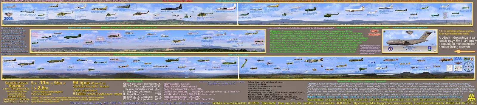 above: HiRes! Artwork of Juci'bacsi's "Air Art Grafika" artwork for 70th Anniversary HuAF Air Show 2008. aug. and European AF's Chief of Staffs' meet at Kecskemét (LHKE) Hu AFB 15 august in 'Gripen' hangar. 6 pcs. - db. x 11m x 1m canvas printed by HuMoD/HDF Chartogaphy Institute - HM/MH "Tóth Ágoston" Térképészeti Intézet -Budapest-. HiRes! The molinos had been showing the HuAF sekvential history wit Hungarian landscape backround with wide angle (170 fok) panoramic photos. Three panoramic photos Juci'bacsi's Photo-PC artwork: 2nd. Molino: Várpalota-Hajmáskér Firing-Range with Kádárta-village and 'Papod' peak from M8 main road close to Veszprém-city.